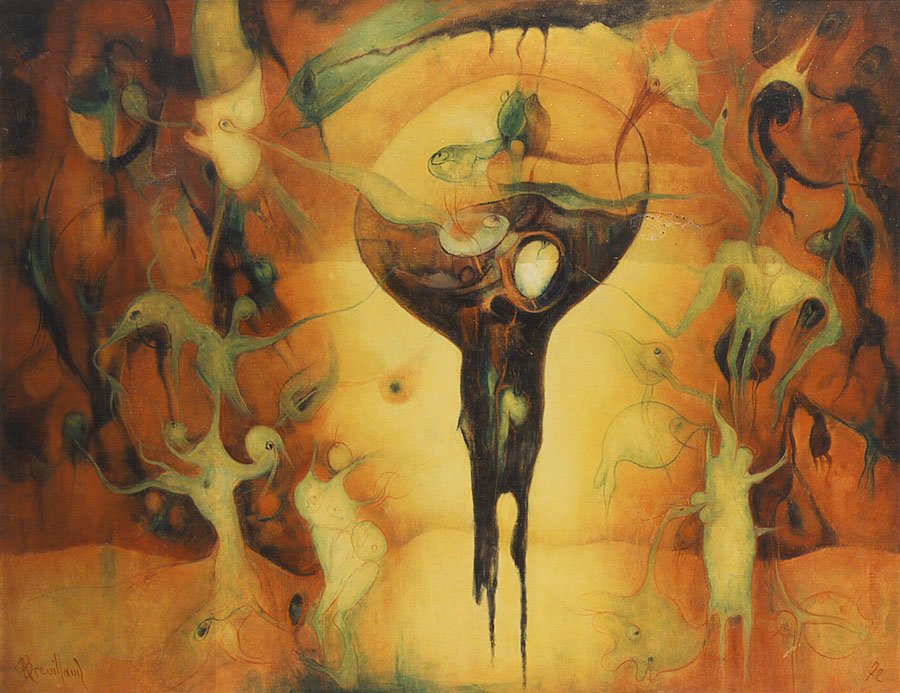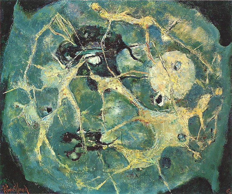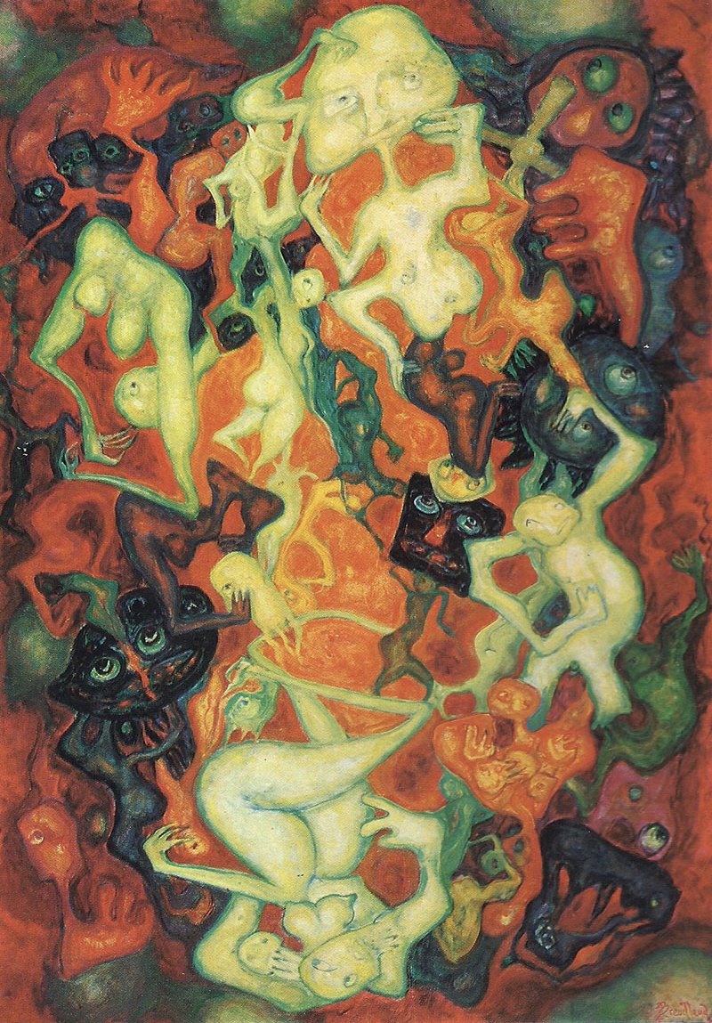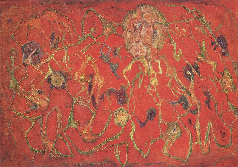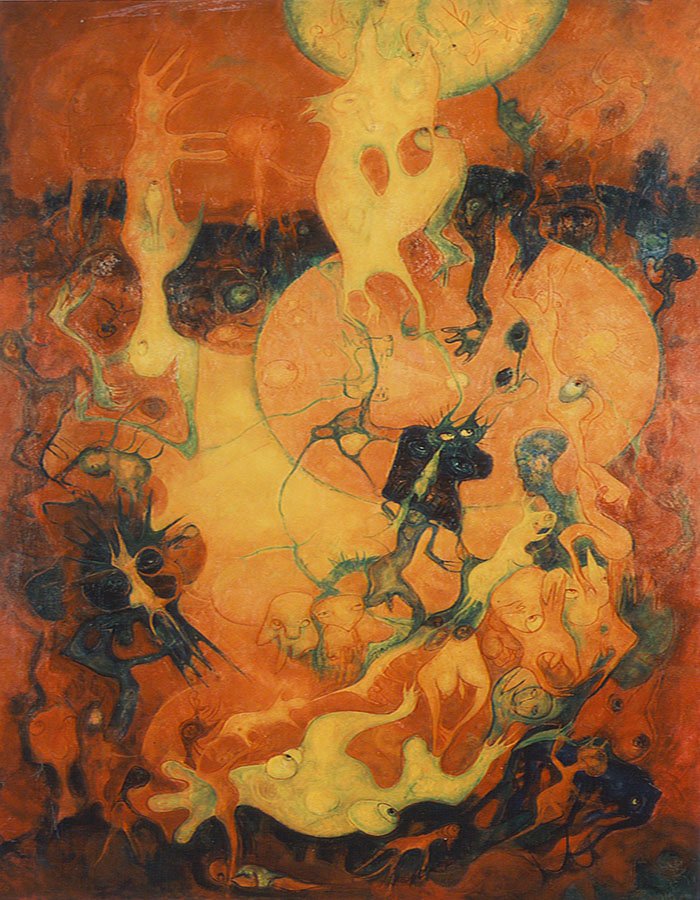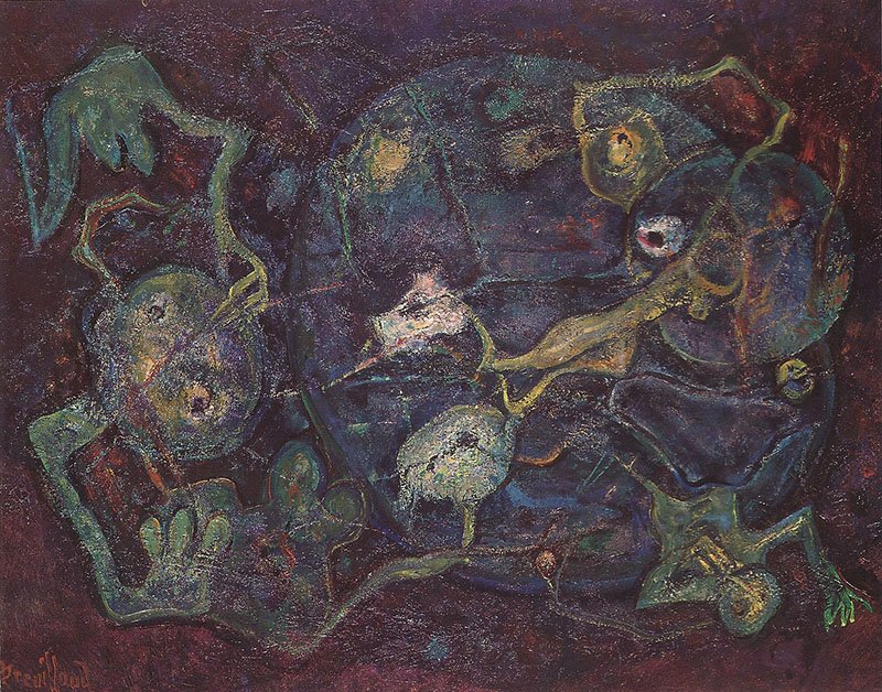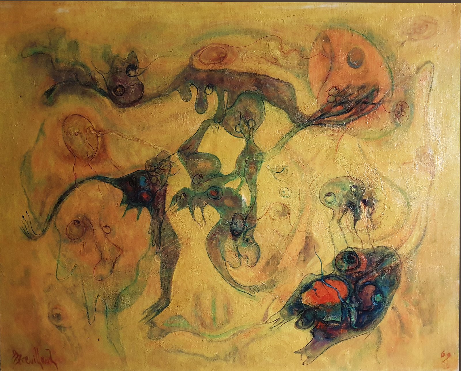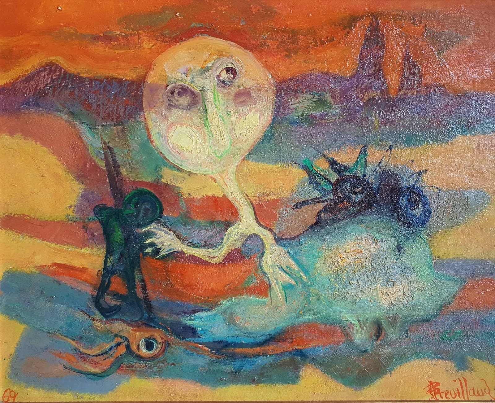 Dans la solitude de son atelier surgissent en lui des fantasmes. Il découvre un monde d'êtres hybrides et torturés se projetant dans les espaces intersidéraux. Tous ces êtres en décomposition lui font éprouver un besoin de recréation. Après cette grande méditation, il reprend ses pinceaux pour traduire plastiquement ses sensations dans le but de dégager de tout ce magma de branches et de pierres, des forces humaines et animales. Ces recherches sont élaborées dans des matières et des couleurs qui doivent être riches, et bien vieillir comme des pierres précieuses.