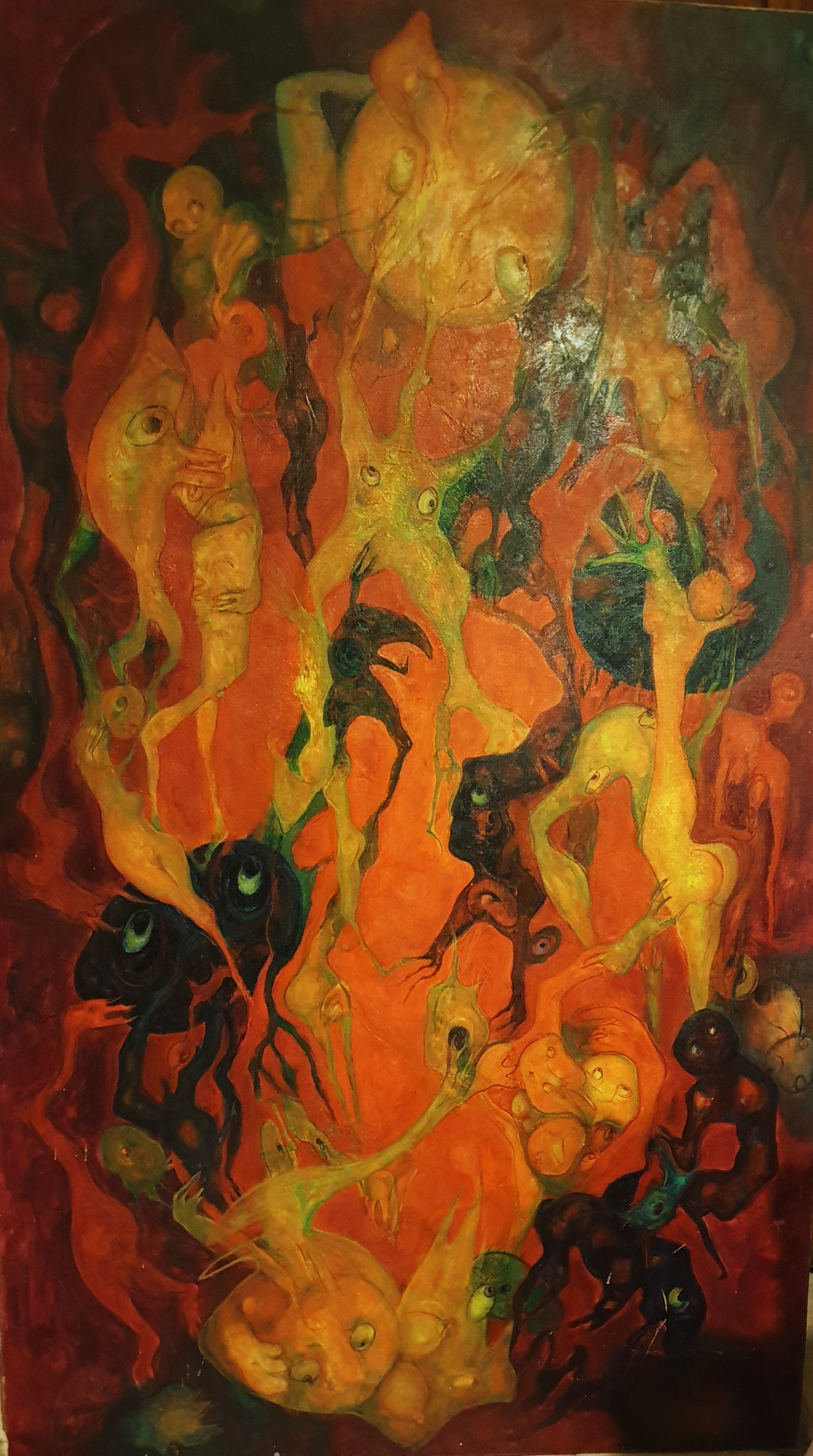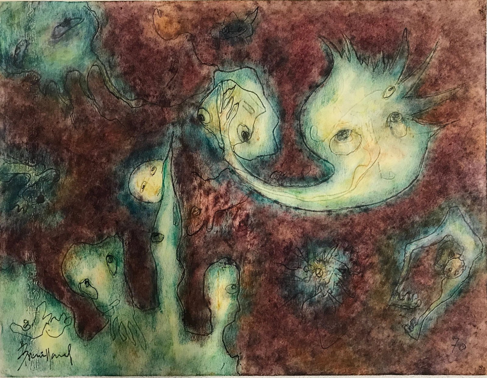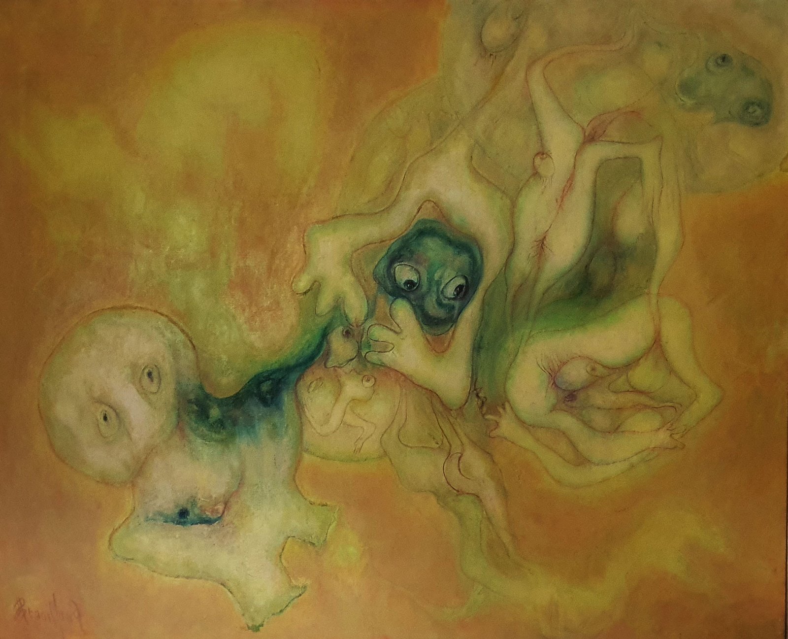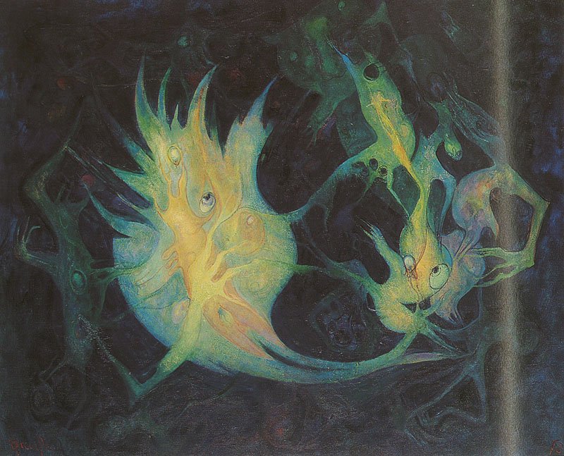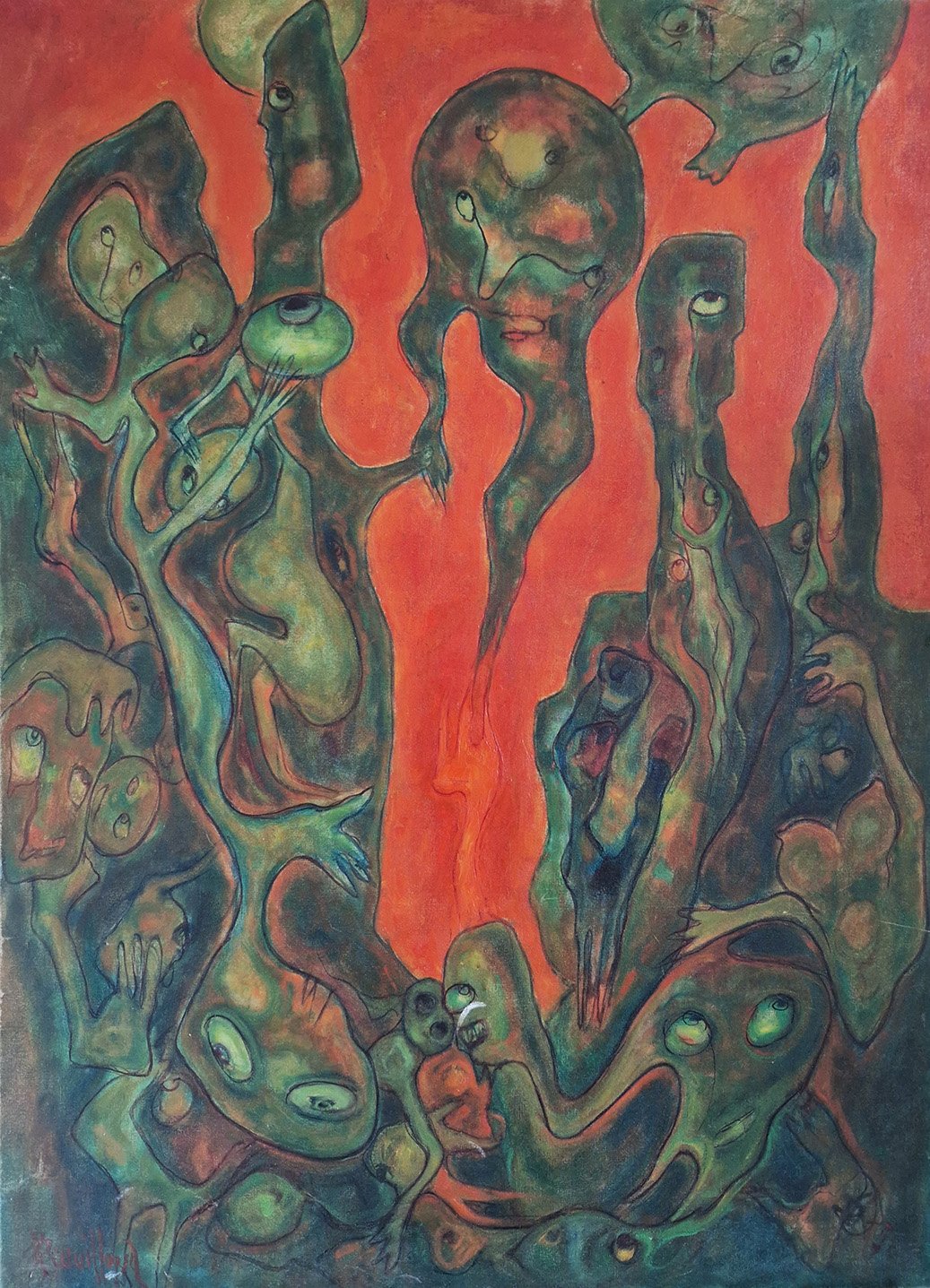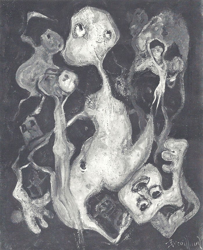 Dans la solitude de son atelier surgissent en lui des fantasmes. Il découvre un monde d'êtres hybrides et torturés se projetant dans les espaces intersidéraux. Tous ces êtres en décomposition lui font éprouver un besoin de recréation. Après cette grande méditation, il reprend ses pinceaux pour traduire plastiquement ses sensations dans le but de dégager de tout ce magma de branches et de pierres, des forces humaines et animales. Ces recherches sont élaborées dans des matières et des couleurs qui doivent être riches, et bien vieillir comme des pierres précieuses.