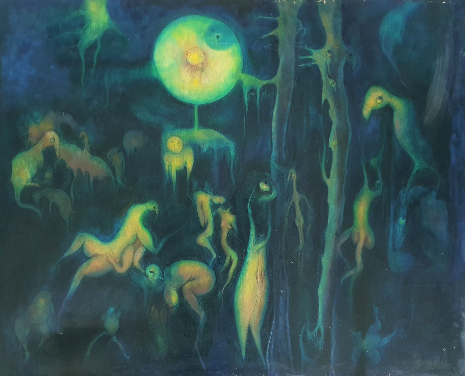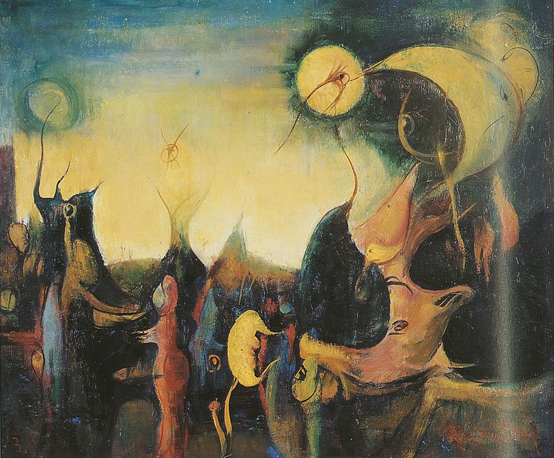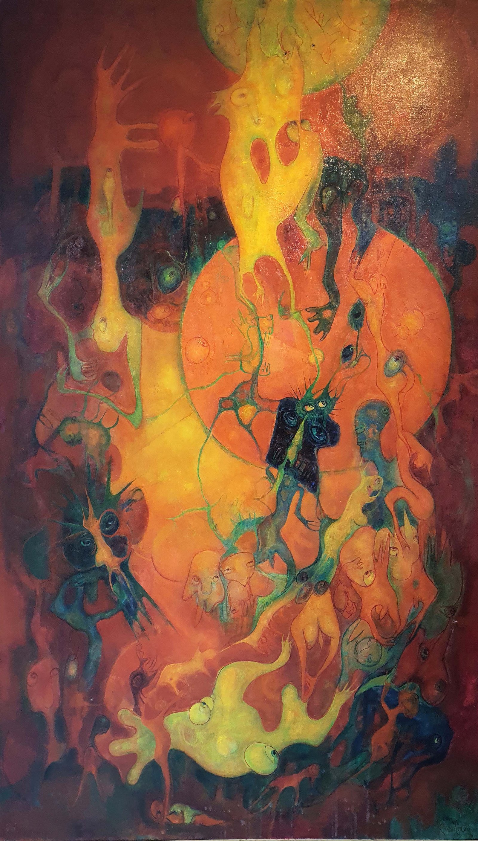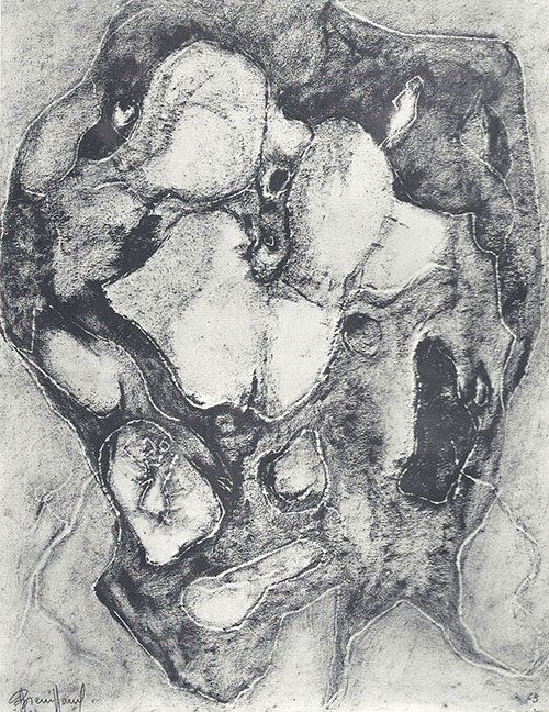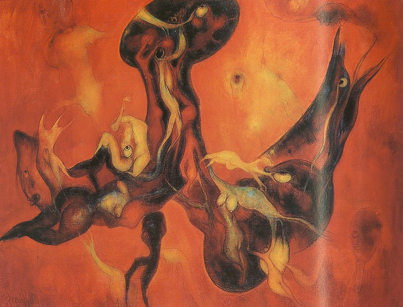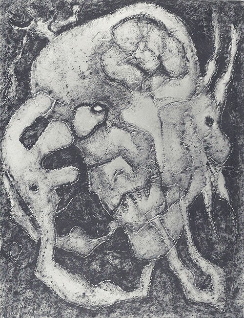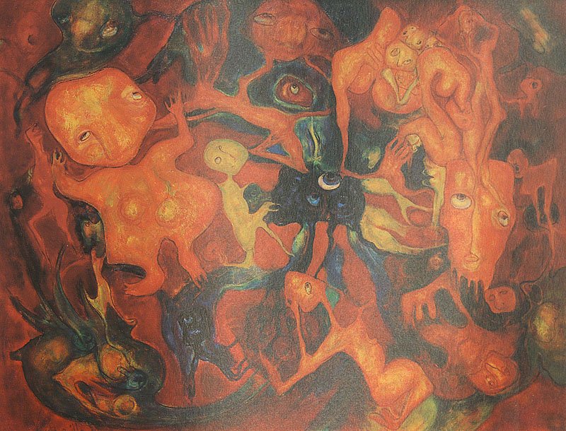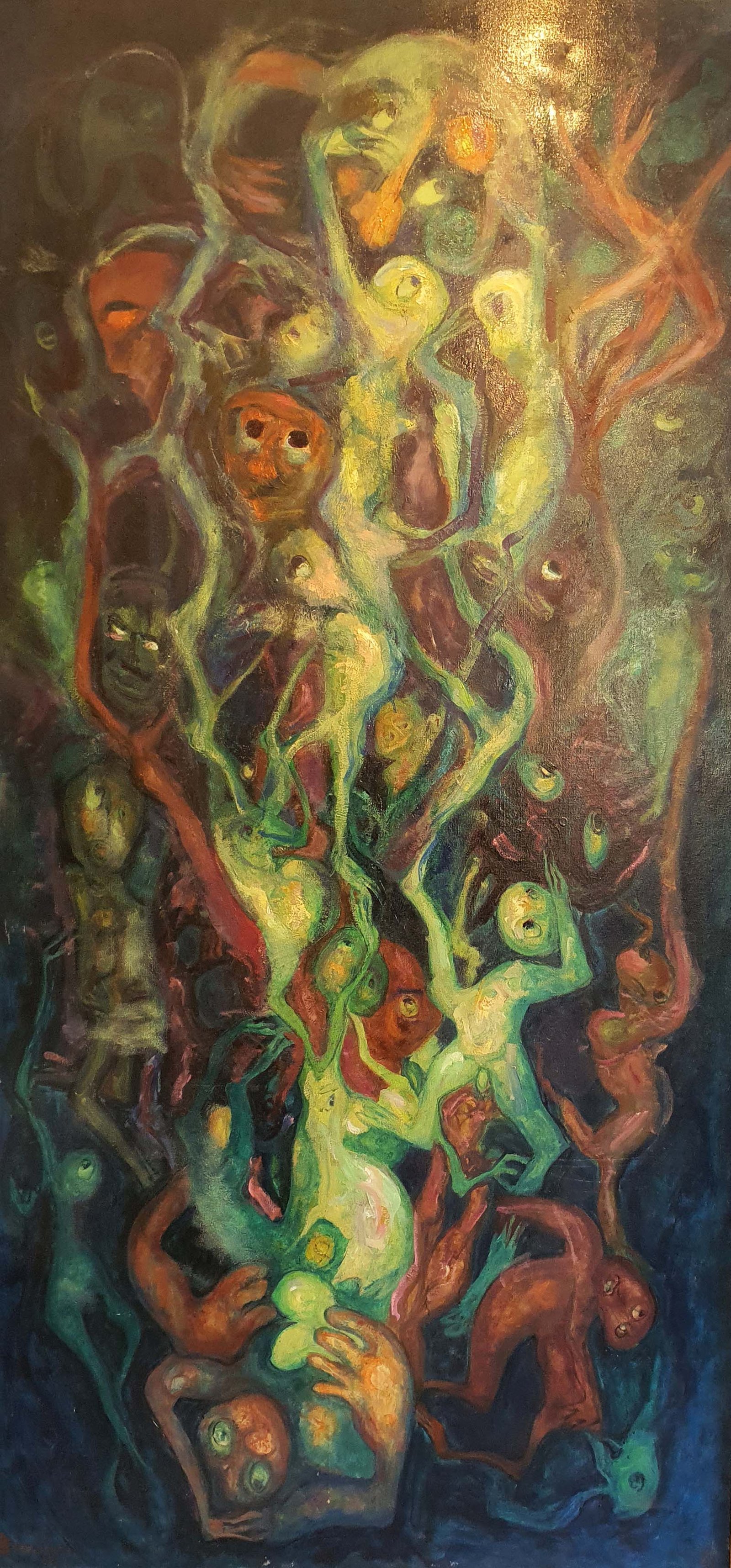 Dans la solitude de son atelier surgissent en lui des fantasmes. Il découvre un monde d'êtres hybrides et torturés se projetant dans les espaces intersidéraux. Tous ces êtres en décomposition lui font éprouver un besoin de recréation. Après cette grande méditation, il reprend ses pinceaux pour traduire plastiquement ses sensations dans le but de dégager de tout ce magma de branches et de pierres, des forces humaines et animales. Ces recherches sont élaborées dans des matières et des couleurs qui doivent être riches, et bien vieillir comme des pierres précieuses.