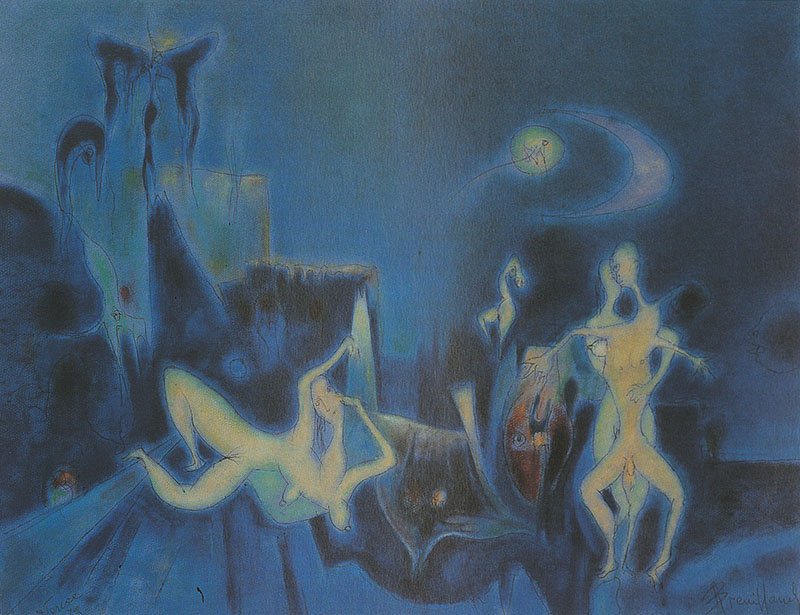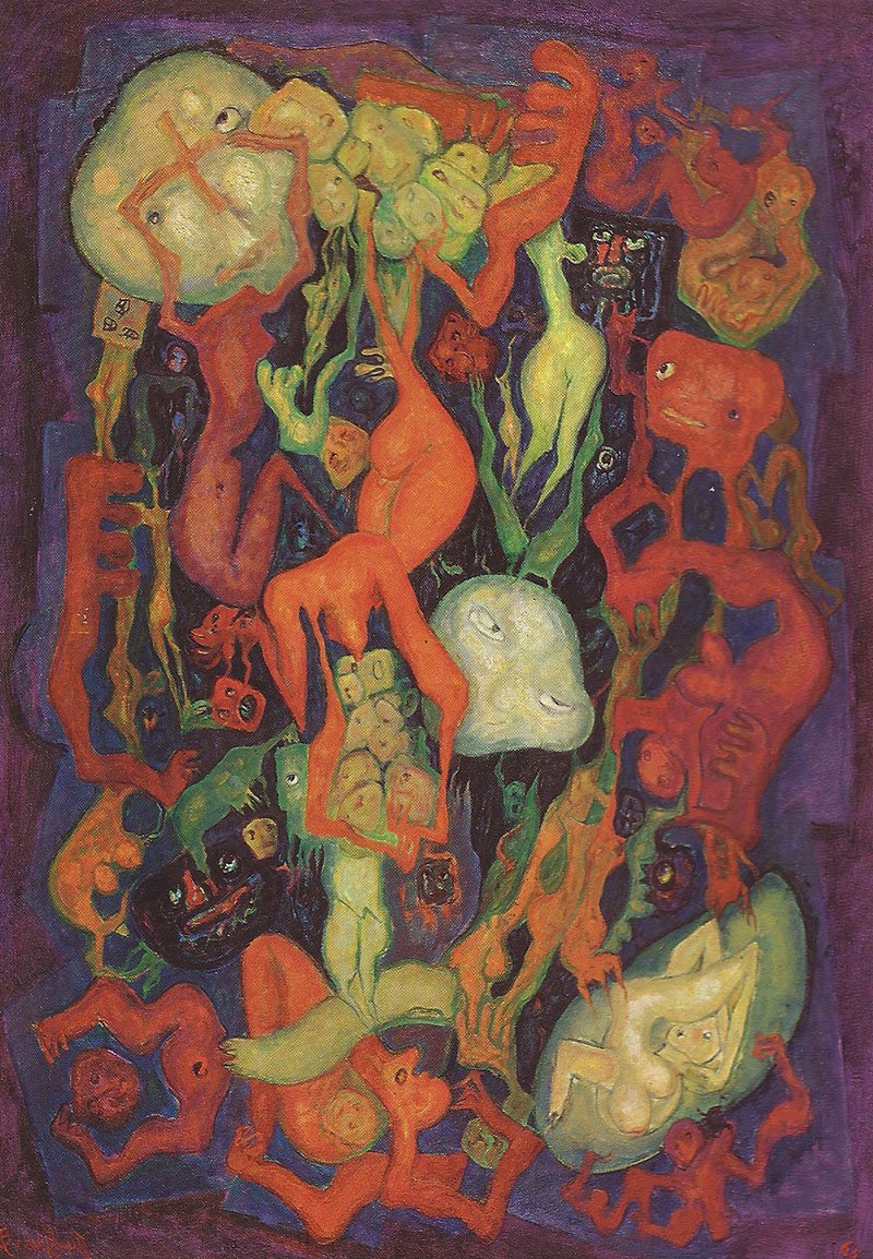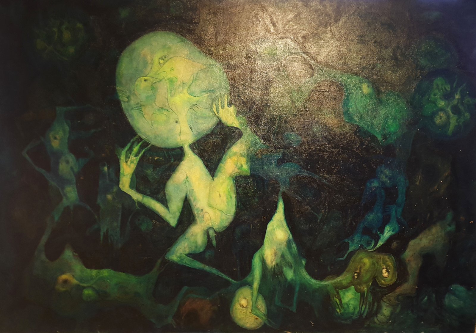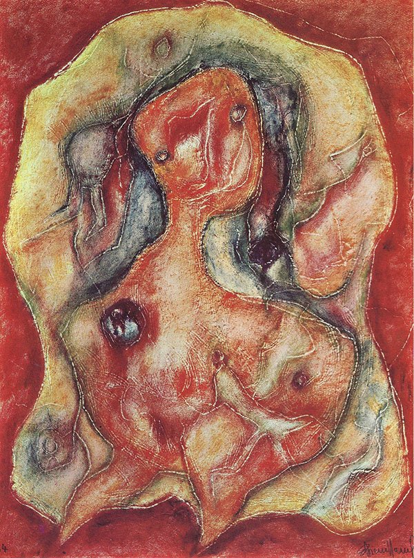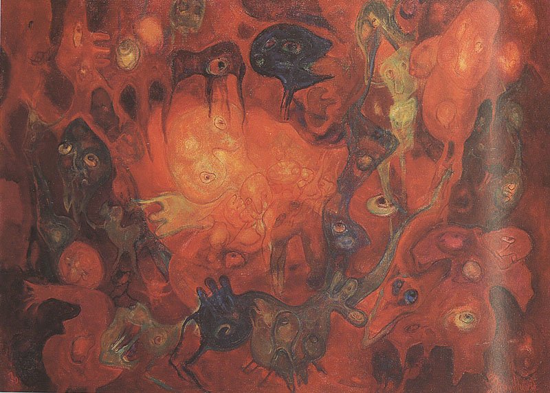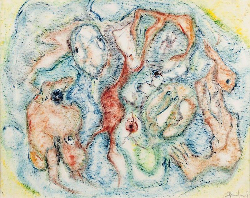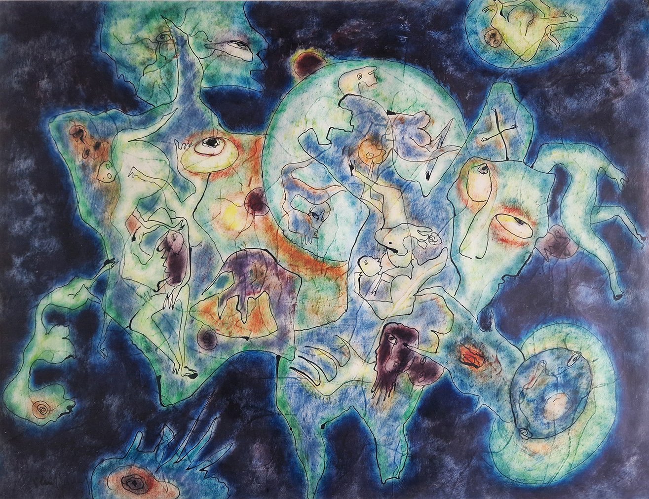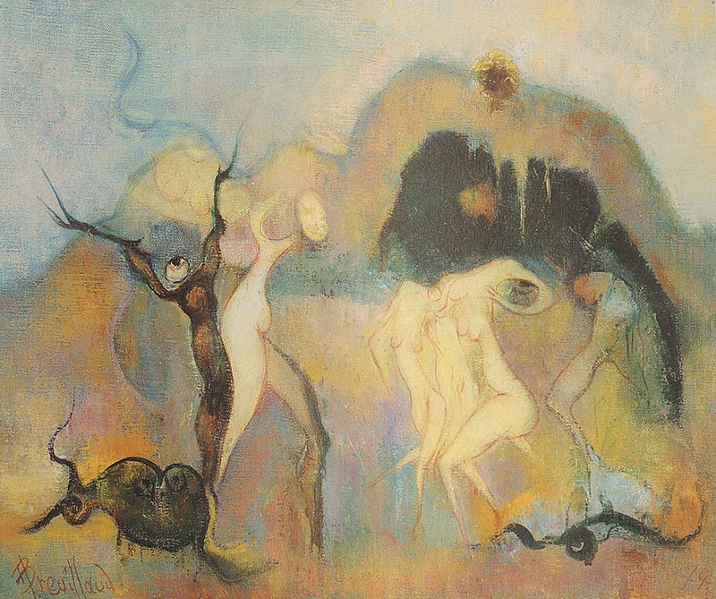 Dans la solitude de son atelier surgissent en lui des fantasmes. Il découvre un monde d'êtres hybrides et torturés se projetant dans les espaces intersidéraux. Tous ces êtres en décomposition lui font éprouver un besoin de recréation. Après cette grande méditation, il reprend ses pinceaux pour traduire plastiquement ses sensations dans le but de dégager de tout ce magma de branches et de pierres, des forces humaines et animales. Ces recherches sont élaborées dans des matières et des couleurs qui doivent être riches, et bien vieillir comme des pierres précieuses.