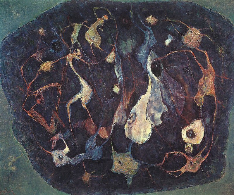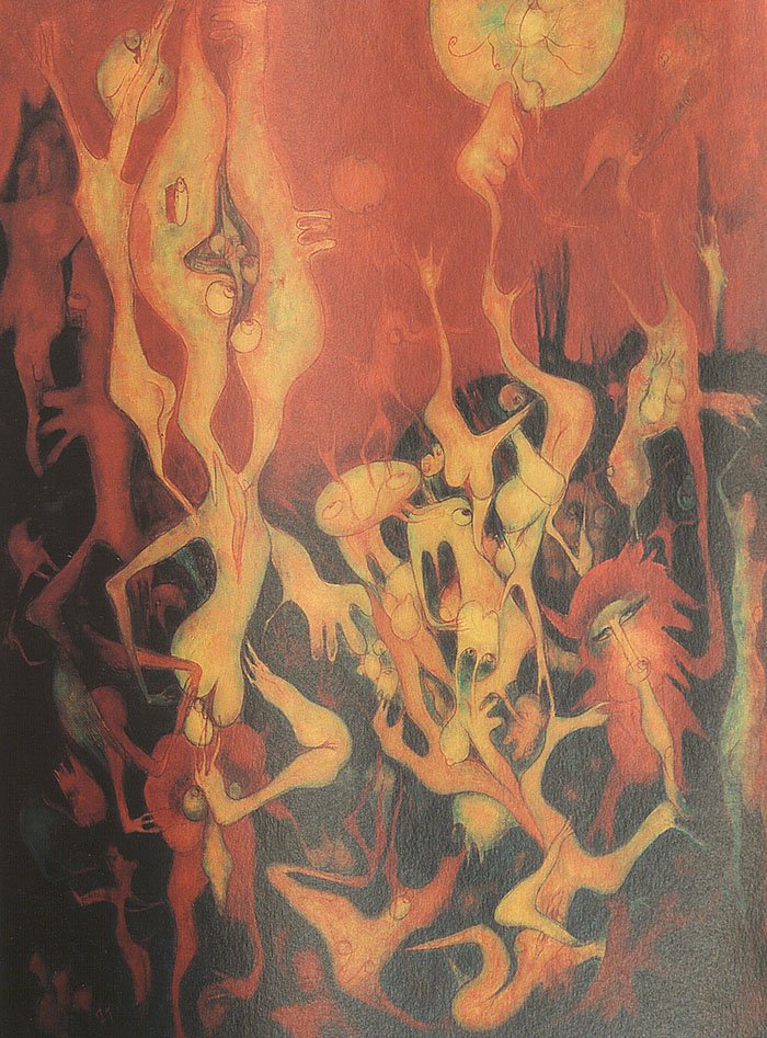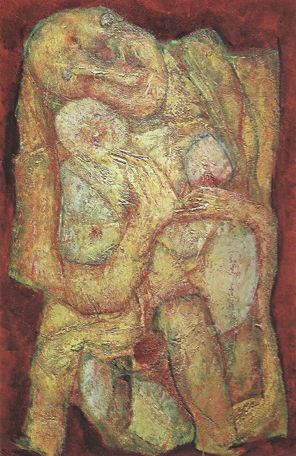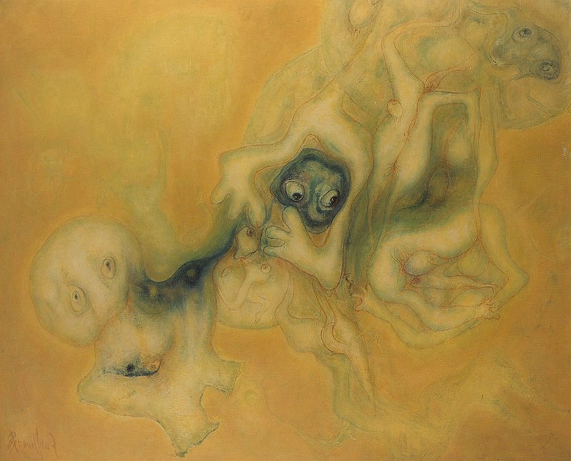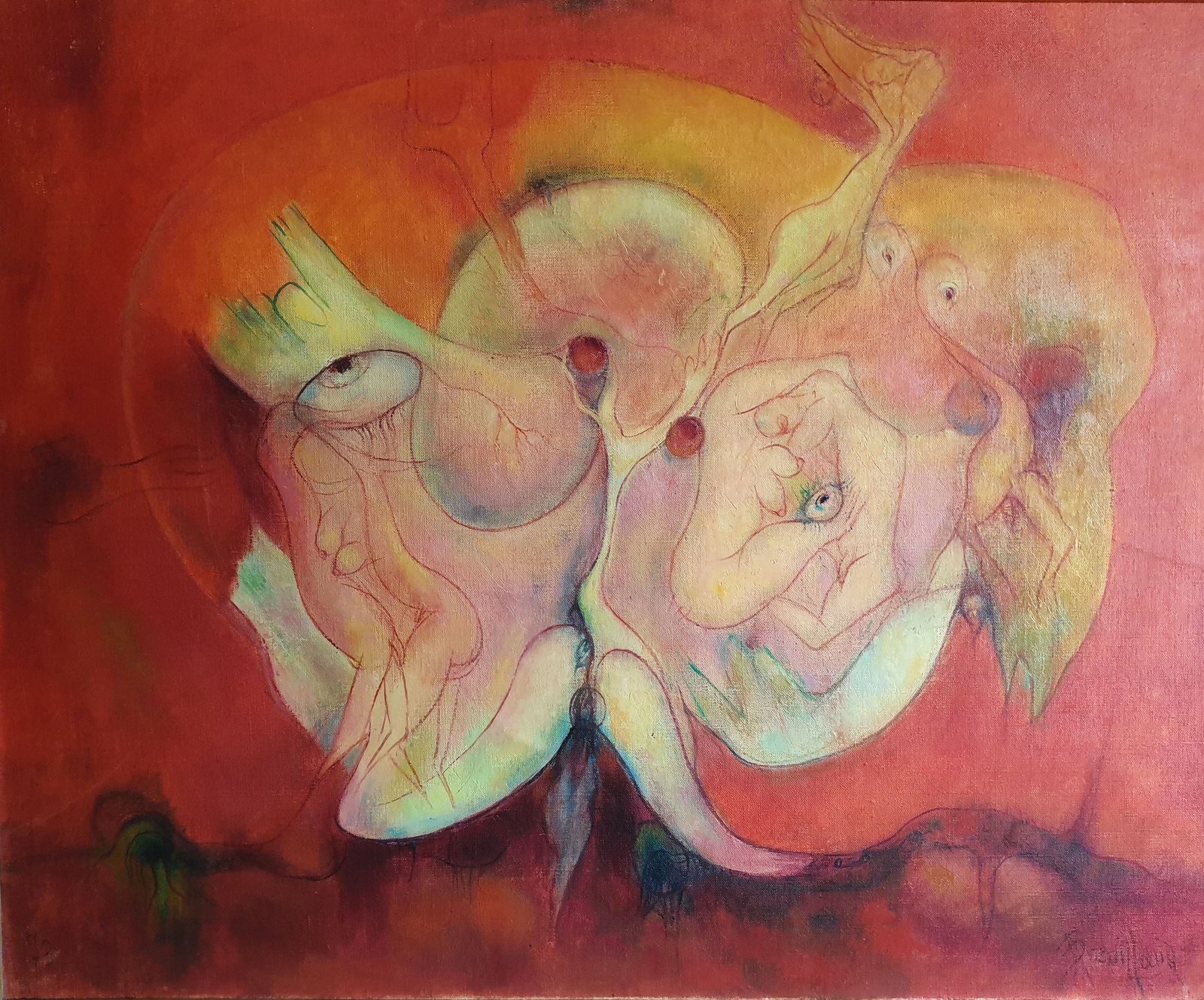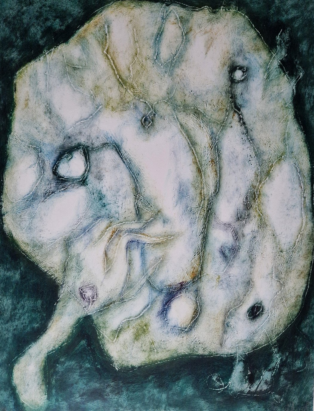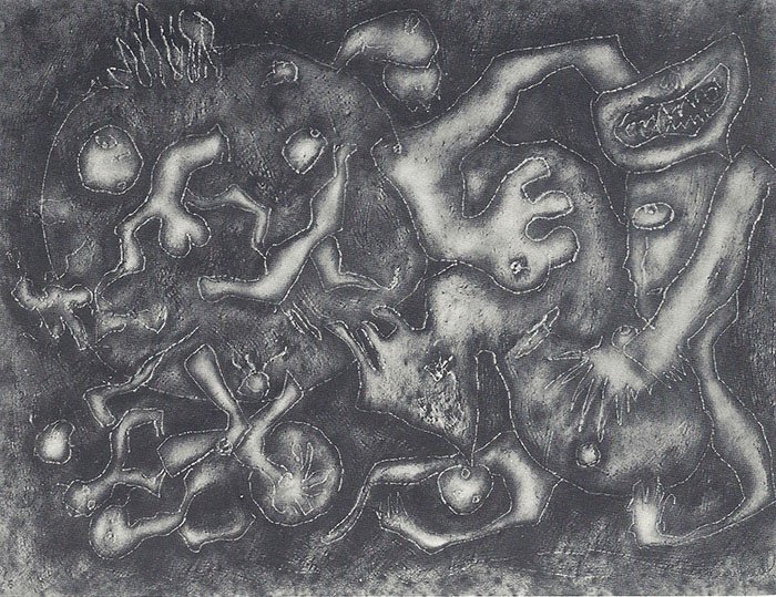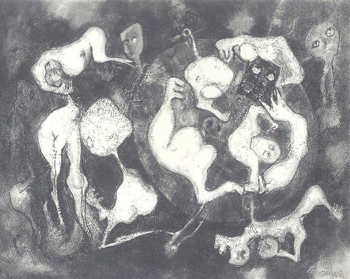 Dans la solitude de son atelier surgissent en lui des fantasmes. Il découvre un monde d'êtres hybrides et torturés se projetant dans les espaces intersidéraux. Tous ces êtres en décomposition lui font éprouver un besoin de recréation. Après cette grande méditation, il reprend ses pinceaux pour traduire plastiquement ses sensations dans le but de dégager de tout ce magma de branches et de pierres, des forces humaines et animales. Ces recherches sont élaborées dans des matières et des couleurs qui doivent être riches, et bien vieillir comme des pierres précieuses.